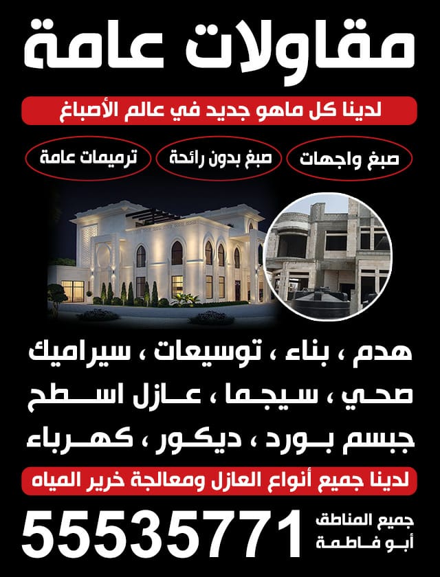 نحن أبو ضاحي للخدمات العامة في الكويت – 55535771، نمتلك خبرة واسعة في مجال المقاولات والصيانة والترميمات العامة، ونحرص دائمًا على تقديم أعمالنا بجودة عالية وبأفضل الأسعار. هدفنا هو تلبية احتياجات عملائنا بأعلى مستوى من الاحترافية والالتزام بالمواعيد